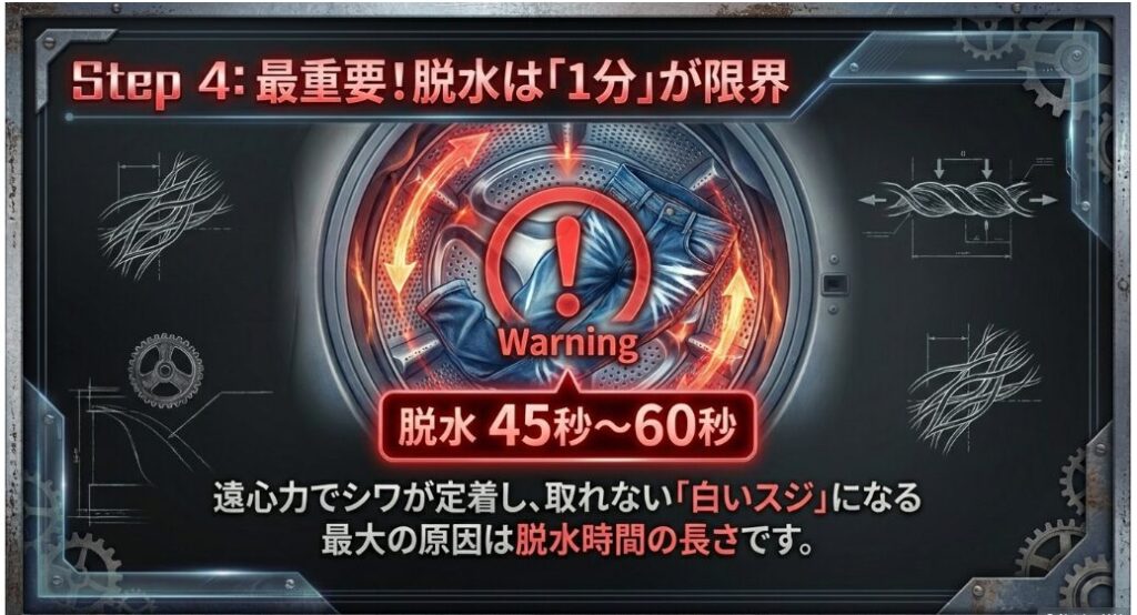 ここが一番のポイントです。洗濯機の脱水機能を使い、手動で「45秒〜1分以内」に設定してください。びしょ濡れで構いません。水分が重りとなって、干した時に自重でシワを伸ばしてくれるからです。長時間回すと、遠心力で「あのスジ」が復活してしまいます。