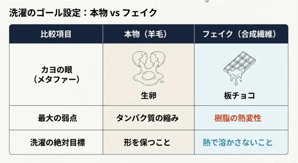 お洗濯を始める前に、まずお手元のコートの「正体」を突き止めましょう。なぜなら、本物のムートンは「タンパク質」、フェイクムートンは「プラスチック(合成繊維)」でできているからです。この違いを無視して、ネットで見た「ムートンの洗い方」をフェイクに試すと、取り返しのつかない事故につながります。
