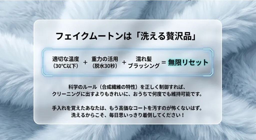 洗濯機が止まった瞬間の「重さ」に驚かないで。それは物理的に汚れが抜けた証拠。科学のルールさえ守れば、フェイクムートンはもっと長く、もっときれいに付き合える最高の相棒になります!