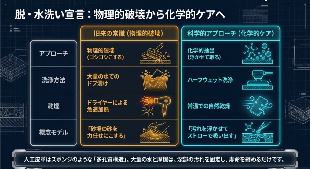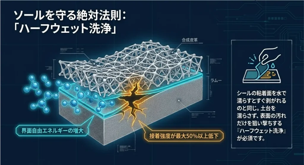 私も昔、子供の通学靴をスッキリさせたくて一晩水に漬けておいたら、翌朝ソールがペロッと剥がれかけて絶望したことがあります……。人工皮革は「水を通すけど溜め込みやすい」という特性があるので、最小限の水で攻めるのが鉄則ですよ!