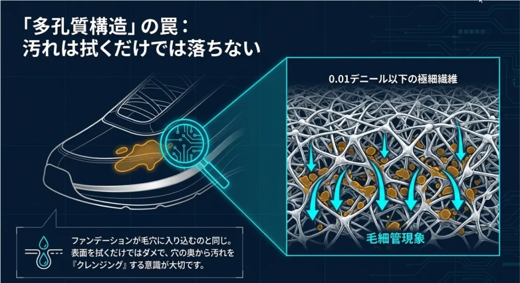 汗の成分が残ったままだと、人工皮革の表面がベタついたり、変な臭いが発生したりします。これは「加水分解」といって、素材が水分と化学反応を起こしてボロボロになっていく合図。表面的な除菌スプレーだけでは、この「芯の汚れ」は解決できません。