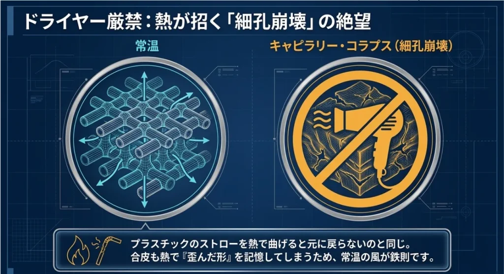 また、水分が急激に抜ける時に、ミクロの穴が内側へ押しつぶされてしまう「細孔崩壊」が起きます。これが、乾燥後に靴がカチカチに硬くなってしまう正体なんですよ。