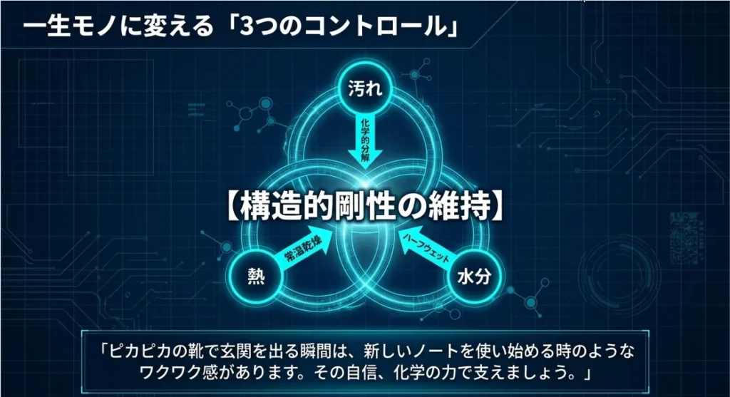 表面は乾いているのに、履いてみると「なんだか重いし、足が冷たい」と感じることはありませんか?それは人工皮革の多孔質構造(ミクロの穴)の中に、汗の塩分を含んだ水気が残っているサインです。塩分は水分を抱え込む性質があるため、しっかりリセットできていないといつまでも乾ききりません。だからこそ、洗う時にしっかり汗の成分を抜き、乾燥時には内部の湿気を吸い取ることが重要なんです。