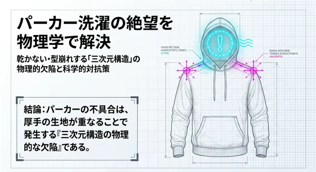 結論から言うと、パーカーの洗濯で最も重要なのは「洗い方」よりも「干し方」の物理マネジメントです。なぜなら、パーカーは水分を含むと1kg近い重量になり、その重さが肩という狭い面積に集中することで、生地が不可逆的に伸びてしまうからです。