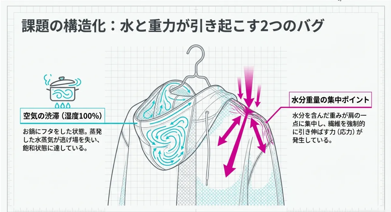 パーカーの肩にできるポコッとした跡。これは物理学では「塑性変形(そせいへんけい)」と呼ばれ、一度ついてしまうと自然には戻らない厄介な状態です。なぜこれが起きるかというと、濡れて「弱くなった」繊維に、水分の「重り」が加わった状態で乾燥が固定されてしまうからなんです。