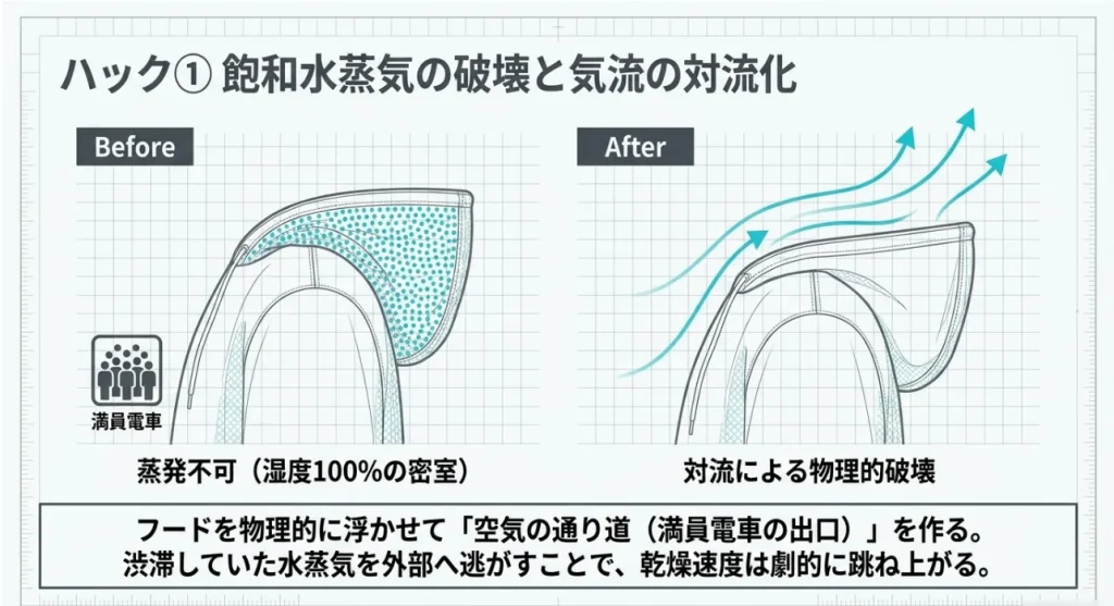 理系的に言うと、水分が蒸発する速さは、繊維の周りの空気の「乾き具合」に比例します。フードを浮かせて隙間を作ることは、この「水蒸気の渋滞」を物理的に解消し、乾いた空気と絶えず入れ替えることで、乾燥スピードを理論上数倍に跳ね上げる行為なんです。