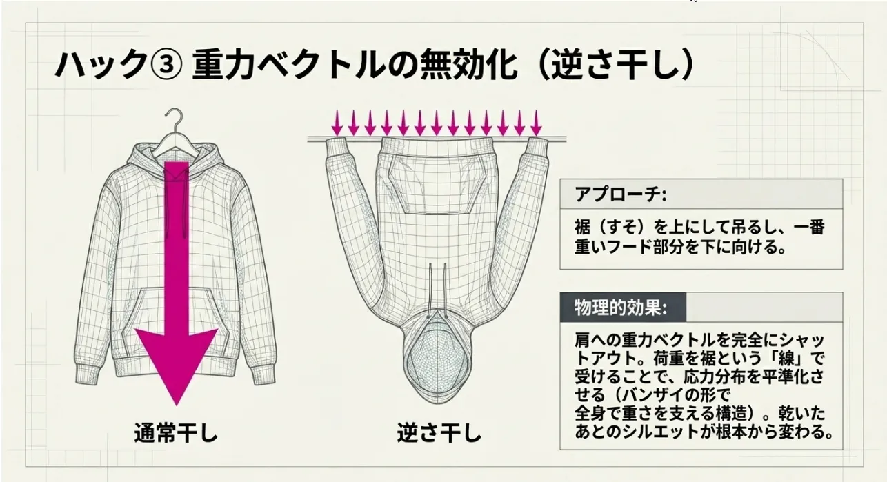 肩という「点」で支えるのをやめて、裾という「線」で支える。これだけで、乾燥中に生地が下に引っ張られる力が均一になり、あの忌々しい肩のポコッとした跡を物理的に封じ込めることができます。さらに、逆さにすることでフードが自然と広がり、空気の通り道も確保できるという一石二鳥のテクニックなんですよ。