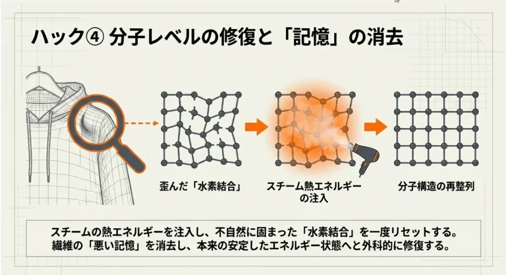もし、うっかりハンガー跡がついてしまっても大丈夫。乾いた後に霧吹きをしてもなかなか戻らないのは、繊維の「水素結合」という分子レベルの握手が、間違った位置でガッチリ固まっているからです。これを無理やり引っ張るのではなく、スチーム(高温の蒸気)のエネルギーで優しく解いてあげましょう。
