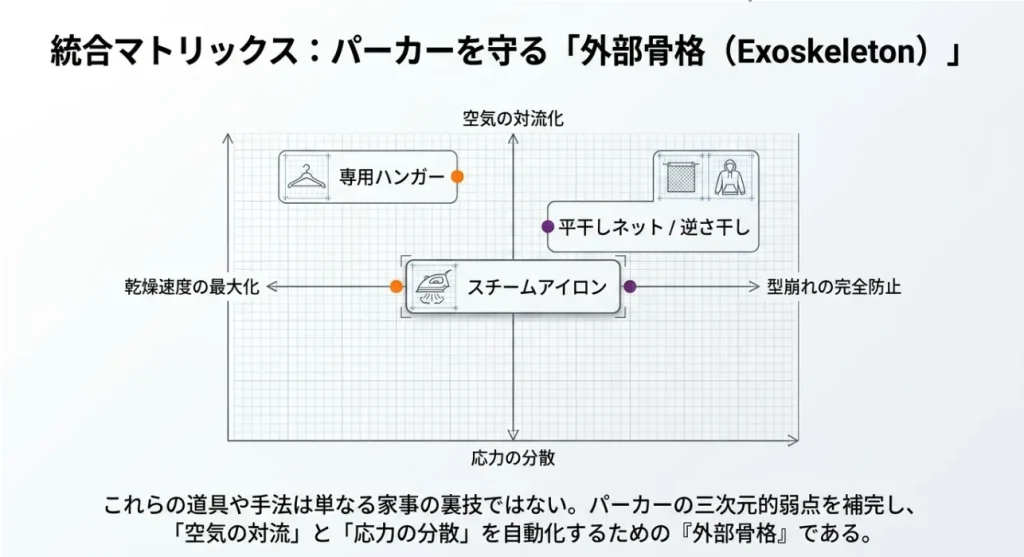 パーカーの「乾かない」「型崩れ」という弱点を補い、プロ級の仕上がりを叶えてくれる道具をまとめました。これらは単なる便利グッズではなく、衣類の寿命を延ばすための「投資」だと私は考えています。