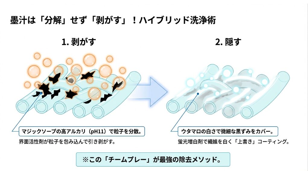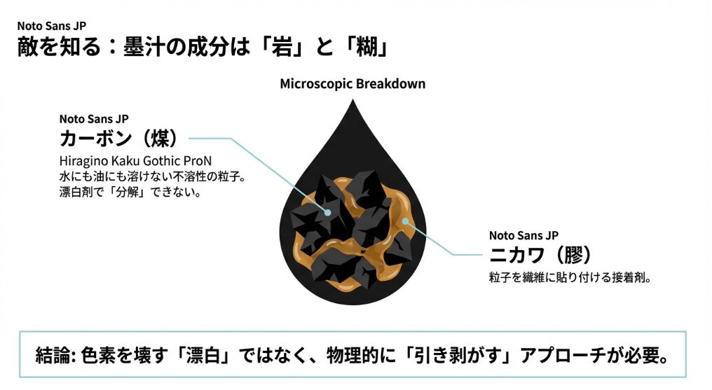 - 墨汁の正体:なぜ普通の漂白剤では「無力」なのか、失敗のメカニズムを解説