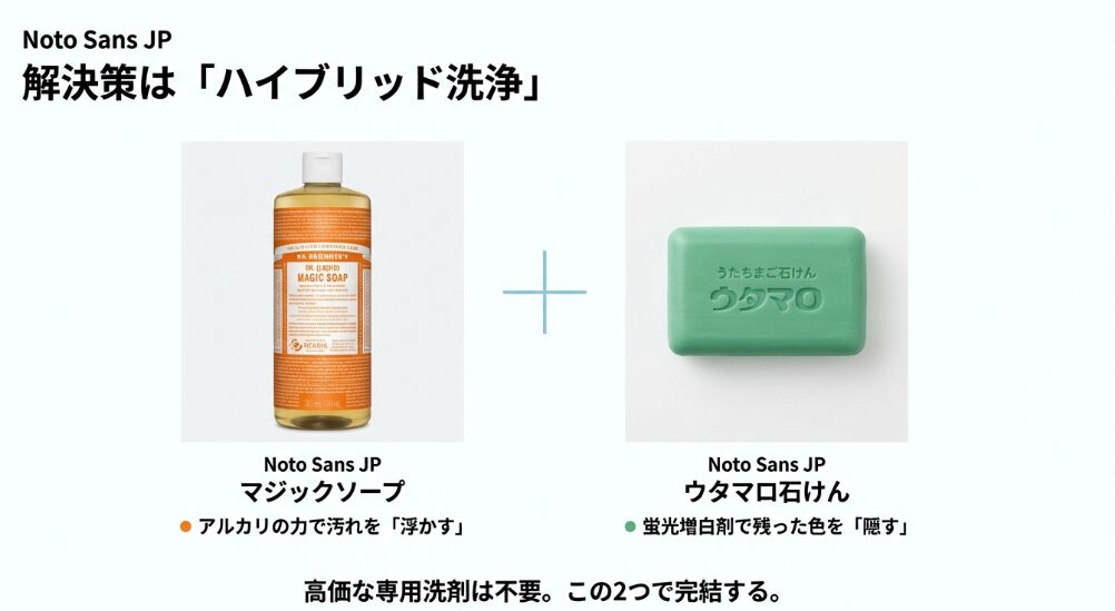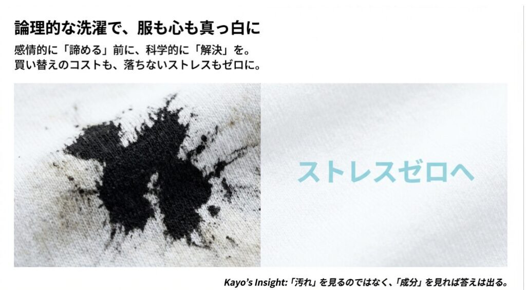 「私のやり方が悪かったのかな」と落ち込まないでくださいね。ネットには間違った情報も溢れていますし、墨汁はプロでも嫌がる強敵なんです。でも、敵の正体が「タンパク質の接着剤」と「ナノ粒子」だと分かれば、打つ手はあります。理屈に基づいた正しい手順で、大切な一着を一緒に救い出しましょう!