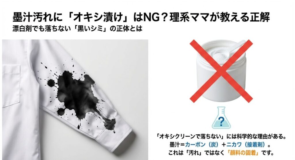 真っ白なシャツや体操服に飛び散った黒い点々。焦って「とりあえずオキシクリーンで漂白!」と試したものの、汚れが広がるばかりで絶望している方も多いはず。実は、墨汁汚れには洗濯の常識が通用しない「化学的なワナ」があるんです。今日は、私が長男のシャツをゾンビ色に染めて泣いた経験からたどり着いた、理系ママ流のレスキュー術をお伝えしますね。