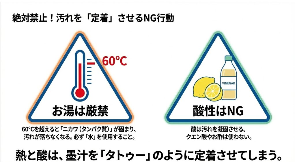 最後に、これだけは絶対にやらないでほしい「禁じ手」をお伝えします。一つは**60℃以上の熱湯**。墨汁の膠はタンパク質なので、熱で固まると繊維と一体化して「永久に取れない岩」になります。