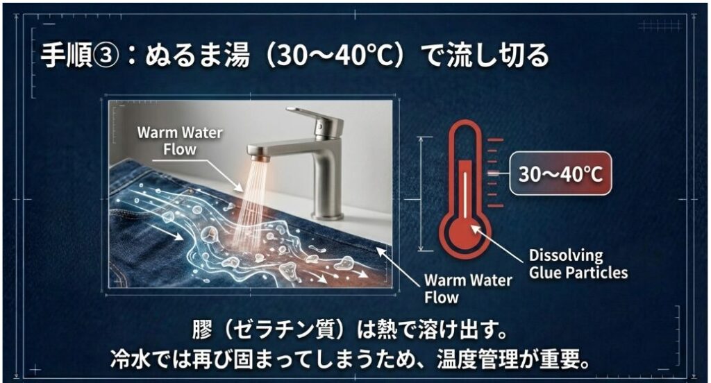 (pH11以上の強アルカリ。厚手デニムの奥まで浸透し、インディゴの粒子はそのままに、墨の接着成分だけをバラバラに加水分解します)