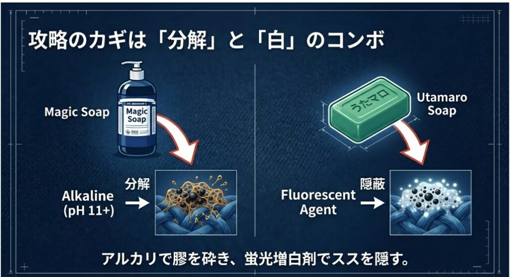 デニムの寿命を縮めず、墨だけを「解体」するには、力技ではなく化学の力が必要です。買い替えれば数万円するセルビッジデニムやヴィンテージも、数百円のこのコンビが救ってくれます。