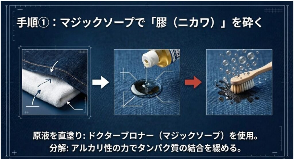 デニムの深い谷間に固まったボンド(膠)を壊すには、通常の洗剤では届きません。キッチン用マジックリンの「強アルカリ」が、このボンドを化学的に分解し、炭素粒子をフリーにします。