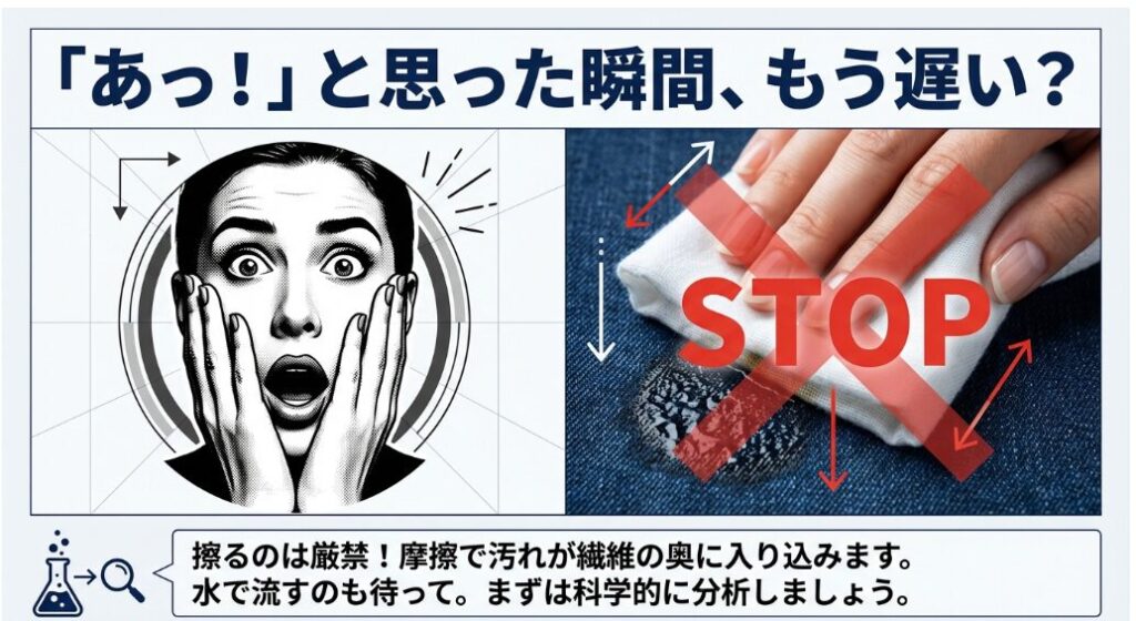 「よりによって、一番高いリーバイスに!」「このデニム、やっと良いアタリが出てきたところなのに…」……喉まで出かかった悲鳴を飲み込み、焦って洗面所でゴシゴシ。でも、擦れば擦るほど黒いシミは繊維の奥へ広がり、挙句の果てにはそこだけ不自然に色が抜けて真っ白に。実は、ジーパンの墨汁汚れには、Tシャツや靴下とは全く違う「素材のワナ」があるんです。