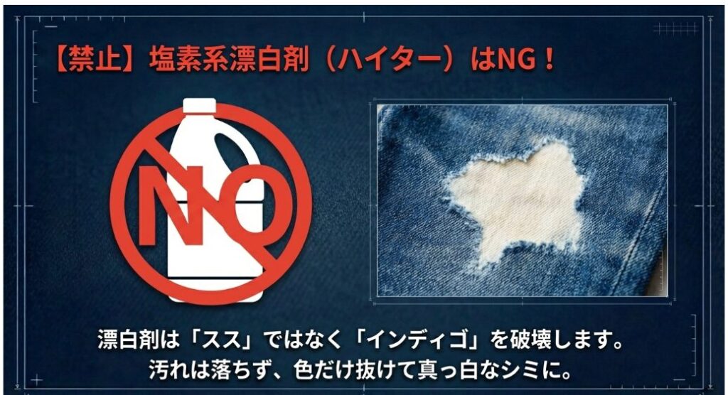 最後に、絶対にやってはいけない「デニムの二次災害」をお伝えします。それは、**「ハイター(塩素系漂白剤)の使用」**です。