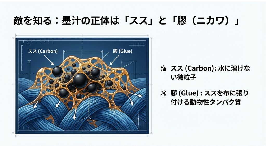 墨汁の正体は「カーボンブラック(炭素の粉)」を「膠(にかわ)」というボンドで固めたもの。ジーパンに墨が落ちると、この微細な粉が綾織りの深い「谷間」の奥底に沈殿します。ここでハンドソープをつけてゴシゴシ擦ると、汚れを出口から遠ざけ、谷のさらに奥、繊維の芯へとボンドを塗り込んでいるのと同じこと。一度こうなると、表面をいくら洗っても黒ずみが消えない「永久のシミ」が完成してしまいます。