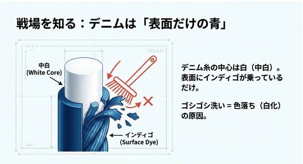 デニムを象徴する「インディゴ染料」は、実は繊維の表面に引っかかっているだけの不安定な染料です。対して墨の「カーボンブラック」は、一度乾くと繊維と一体化するほど強固。焦って強力な洗剤で揉み洗いをすると、先に落ちてほしくないインディゴだけが剥がれ落ち、墨汁の黒だけがしっかり残るという、最悪の「白抜け現象」が起きてしまいます。