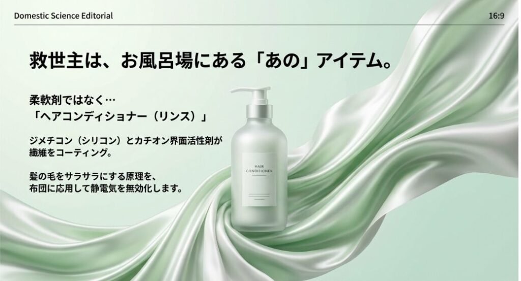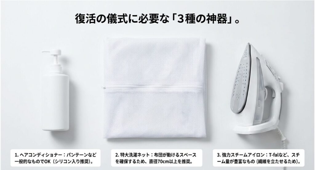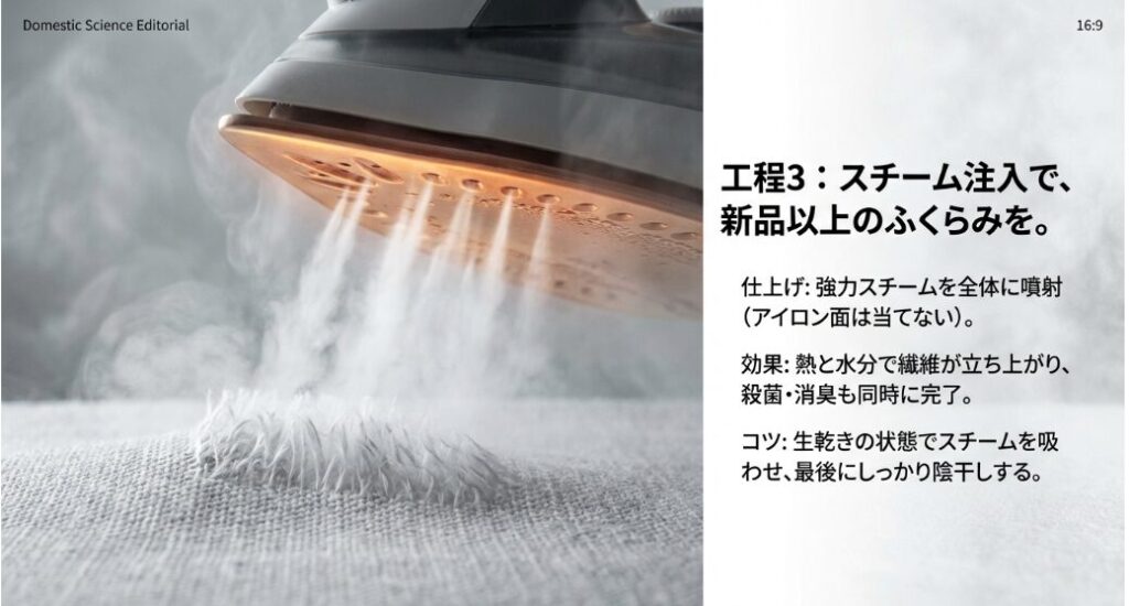 柔軟剤で香りを上書きするのは、汚れの上に蓋をするようなもの。まずは「クエン酸」で繊維を素の状態(pH調整)に戻し、繊維同士のくっつき(水素結合)を解除します。その後、圧倒的な「熱エネルギー」を持つスチームで、潰れた中綿の構造を内側から膨らませるのがロジカルな正解です。