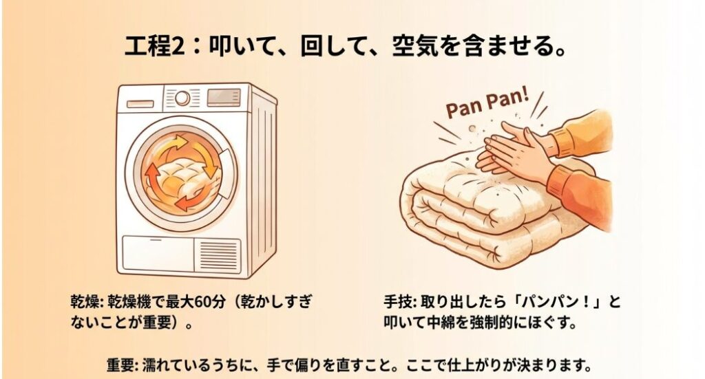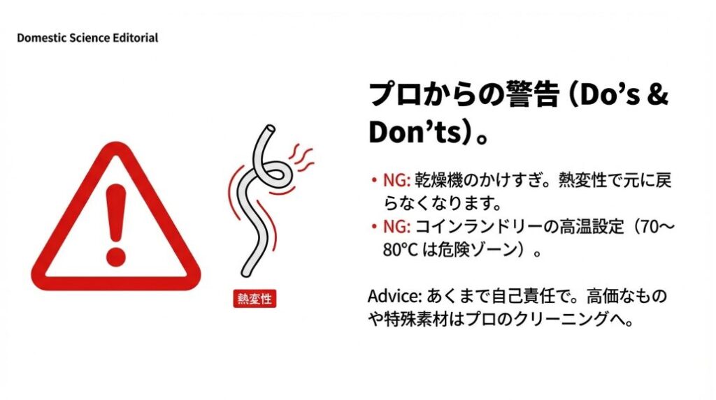 また、ポリエステル素材の中綿は「熱」に非常に弱いです。コインランドリーの乾燥機で70~80℃以上の高温設定にしてしまうと、繊維が溶けて固まる「熱変性」を起こし、こうなると二度と元には戻りません。必ず「低温設定」か、自宅での「自然乾燥+仕上げスチーム」を徹底してくださいね。