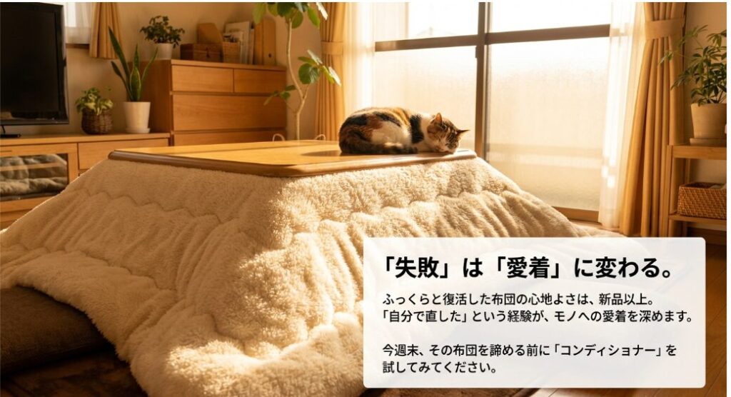 洗濯の失敗は、決してあなたの不手際ではありません。「家族のために綺麗にしてあげたい」という優しい気持ちの結果です。ボコボコになってしまったこたつ布団も、正しい手順で手をかけてあげれば、きっとまたあの日のようにふっくらと温かくあなたを包んでくれるはずです。福井の空の下、頑張るお母さんを私は全力で応援しています!