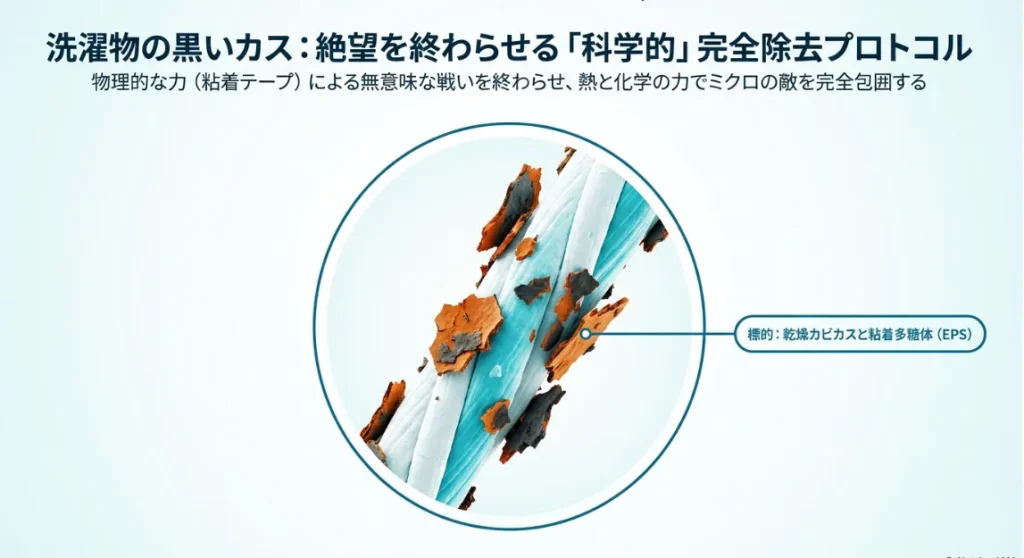 洗濯物についた黒いカスを指先でつまんでみると、意外と硬くて頑固だと思いませんか?実はこれ、ただの汚れではなく、洗濯槽の裏側で育った「黒カビのバリア(バイオフィルム)」が剥がれ落ちたものなんです。
