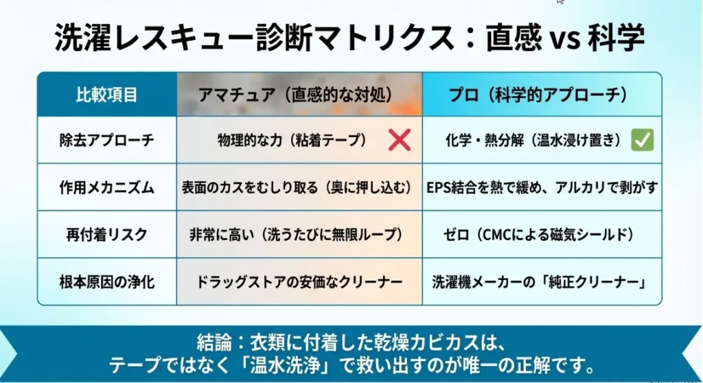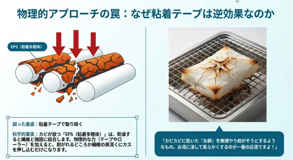 カビは自分の身を守るために、ベタベタした「粘着多糖体」という天然の接着剤を放出します。 これが乾燥すると、繊維とガッチリ水素結合して一体化してしまうんです。例えるなら、服にこびりついて乾いた「水あめ」のような状態。水でジャブジャブ洗ったり、粘着テープで表面だけペタペタしても、繊維の奥入り込んだ根っこまでは引き抜くことができません。むしろ、テープの粘着力がカビの粒子をさらに奥へと押し込んでしまう「物理的トラップ」に陥る危険があるんですよ。