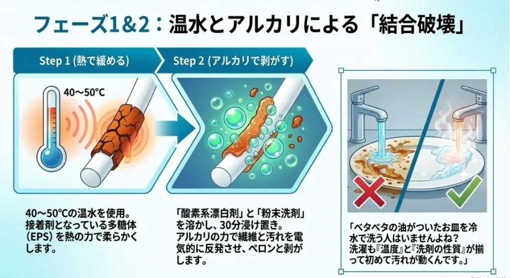 まずは40℃〜50℃の温水を用意しましょう。 お風呂の温度より少し高めのこの温度が、カビの接着剤を緩めるのに最も適しています。ここに「酸素系漂白剤」を投入すると、シュワシュワと発生する酸素の泡がバイオフィルムの網目構造を内側から物理的に破壊してくれます。 さらに「アルカリ性」の粉末洗剤を加えることで、繊維とカビカスの間に電気的な反発力が発生し、汚れがペロンと剥がれやすくなるんです。