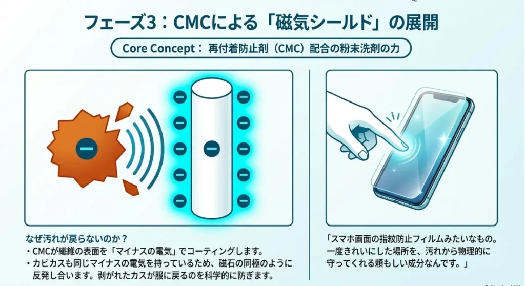 洗濯の科学で「再付着防止剤(CMC)」と呼ばれる成分があります。 これは繊維の表面をコーティングして、水中に浮いているカビカスが再び服に吸い寄せられるのを防いでくれる「透明なバリア」のようなもの。この成分が入っている洗剤を使うだけで、洗い直しの成功率は劇的に上がります。