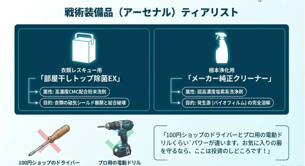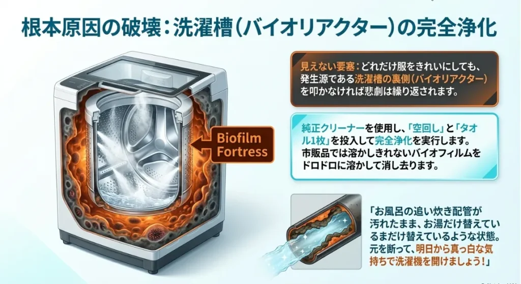 今ある服をきれいにしても、洗濯機そのものが「カビの培養器(バイオリアクター)」になっていては、明日の洗濯でまた同じ悲劇が繰り返されます。衣類を救った後は、その根源である洗濯槽の裏側を徹底的にリセットしましょう。