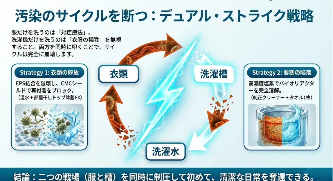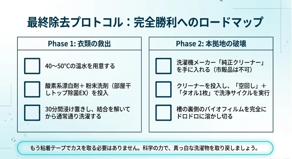 洗濯機から出した瞬間に黒いカスがついているのを見つけると、本当にがっかりしてしまいますよね。でも、今回お話ししたように、カビカスの正体と、それを解体するための「熱・アルカリ・界面制御」の仕組みさえ知っていれば、もう怖くありません。
