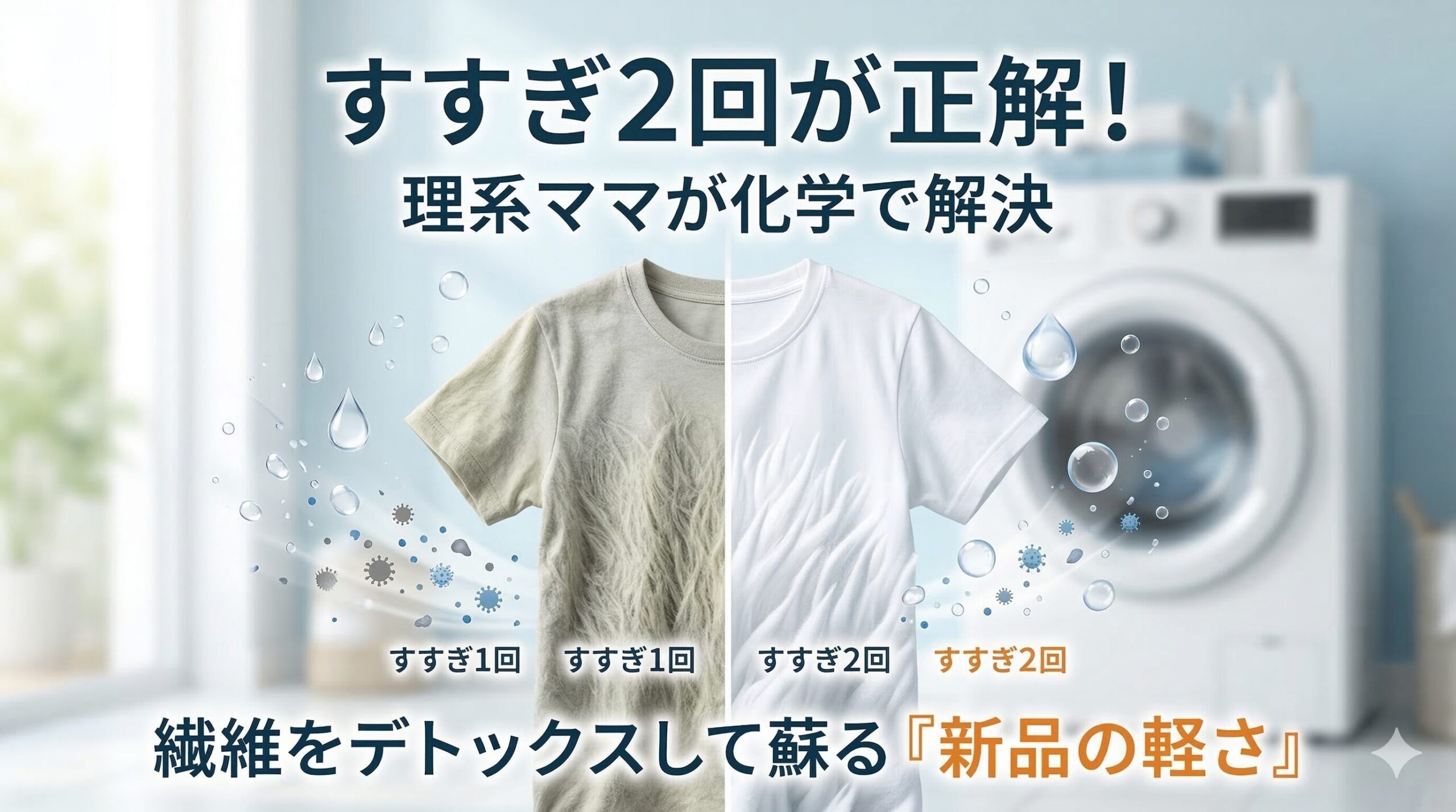 福井のどんよりした曇り空の下で、いかに効率よく、かつ「新品のときのような軽やかさ」を取り戻すか。理系ママとして1日3回の洗濯と格闘してきた私が行き着いた答えは、たった1分の設定変更、つまり「すすぎ2回」への切り替えでした。今回は、なぜ2回すすぐだけで服が劇的に蘇るのか、その理由を化学と物理の視点から分かりやすく解き明かしていきますね。