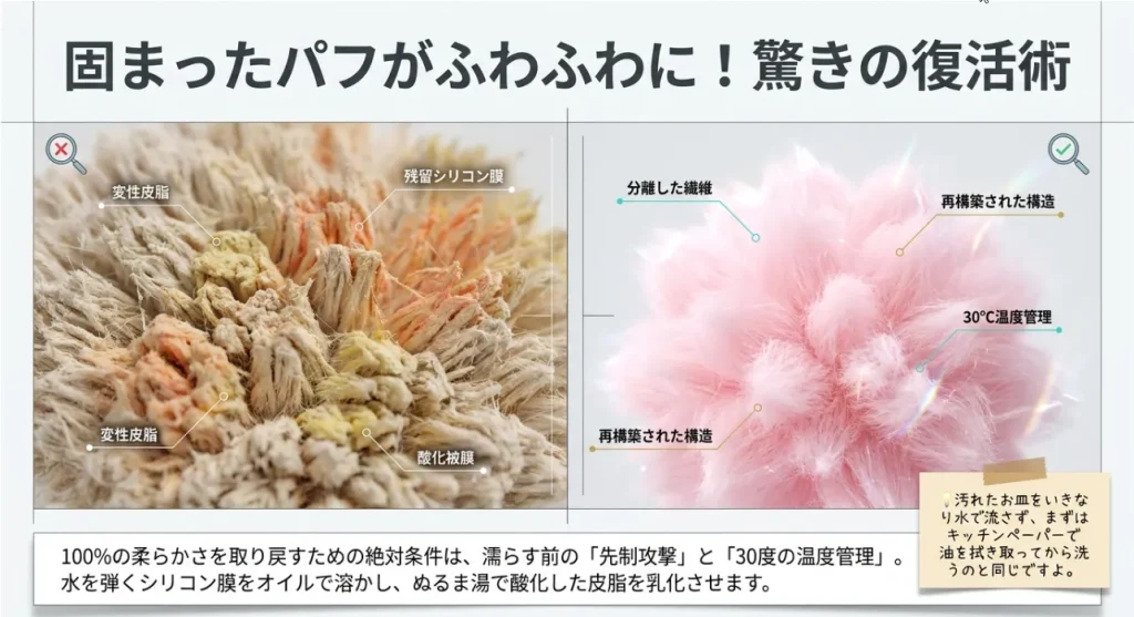 パフが乾いた後に硬くなるのは、繊維が『手をつないだまま』固まった状態。脱水後に軽くパフを叩いてあげるだけで、その絆が解けてふわふわに戻るんですよ。この一手間が、理系ママの愛のムチなんです(笑)