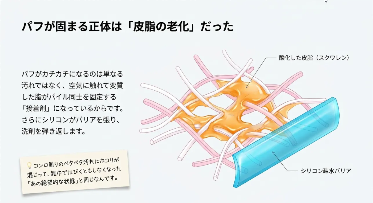 皮脂に含まれる「スクワレン」という成分は、空気に触れると酸化してベタベタした「過酸化脂質」に変わります。これがパフの細かな繊維(パイル)の間に入り込むと、繊維同士をくっつける「接着剤」の役割を果たしてしまうんです。お料理でコンロ周りの油汚れがベタベタに固まるのと同じ現象ですね。これによってパイルが倒れたまま固まり、あのふわふわ感が失われてしまいます。