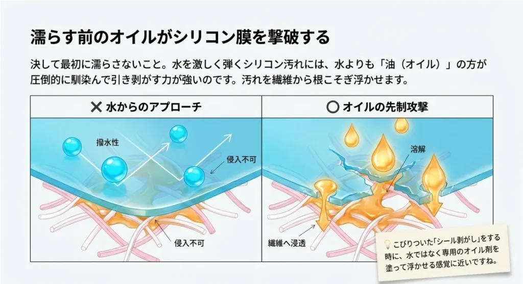 水を弾くシリコン汚れをオイルで溶かし、30度のぬるま湯で皮脂を乳化。この「先制攻撃」と「温度管理」が、繊維の弾力を復活させる唯一の正解です。