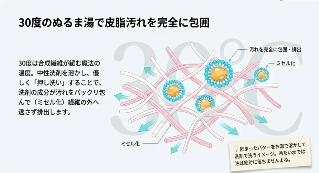30度のぬるま湯が繊維の「こわばり」を解いて弾力を取り戻す