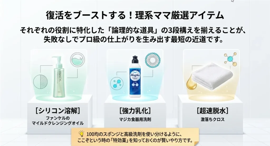 ※これは「今を乗り切る」ことを優先した、代用ありの**「65点」**ルートです。適度な手抜きは継続のコツですが、お気に入りの一着を「新品のような輝き」に戻すなら、やっぱり本編の100点の手法が正解。一段上の仕上がりを体感したい方は、ぜひこのまま本編を読み進めてみてくださいね。