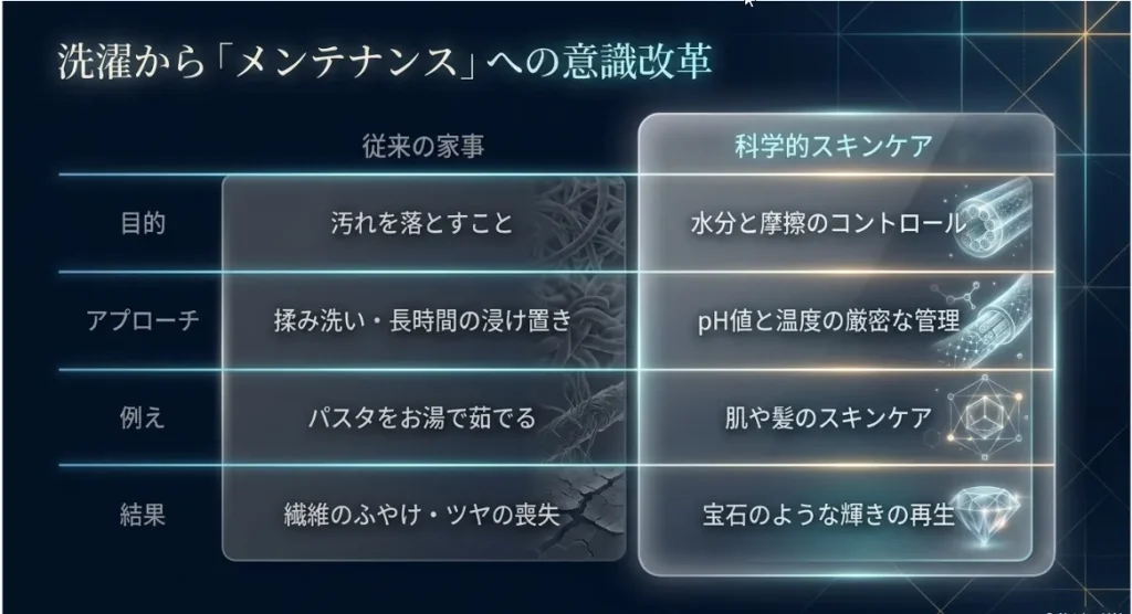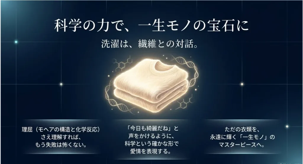 アンゴラ山羊が育んだ「ダイヤモンド・ファイバー」モヘア。その美しさを維持するための答えは、意外にもシンプルな「pH管理」と「潤滑保護」にありました。難しく考えがちな洗濯も、繊維が喜ぶ環境を整えてあげるという科学的な視点を持つだけで、失敗の絶望は「お気に入りをお手入れする自信」に変わります。