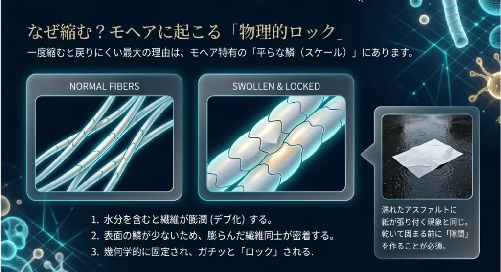 最後に、なぜモヘアに「お湯」や「強い摩擦」が厳禁なのか、その理由を少しだけお話ししますね。モヘアは一度激しく縮んでしまうと、羊毛(ウール)よりも修復が難しいと言われています。それは、平滑な繊維同士が密着して絡み合うことで、幾何学的にガチッと固定される「物理的ロック」状態に陥るからです。