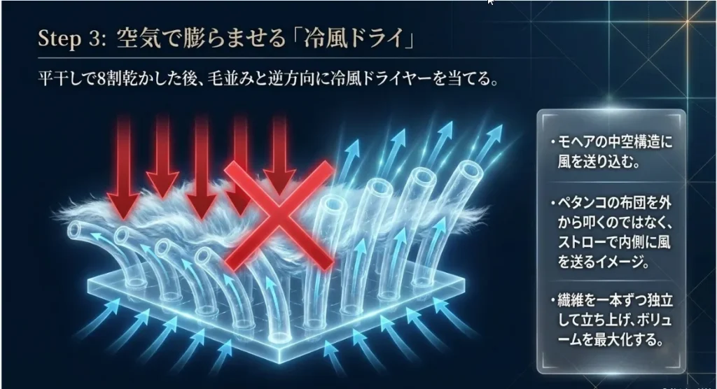 そして、8割ほど乾いたタイミングで「冷風ドライヤー」の出番です。毛並みと逆方向に風を当てることで、繊維の中の空洞と毛足の間に空気を強制的に送り込みます。これが、あの「空気を含んだようなふわふわ感」を呼び戻す決定打。温風だと繊維が傷むので、必ず「冷風」を使うのが理系ママの約束ですよ。