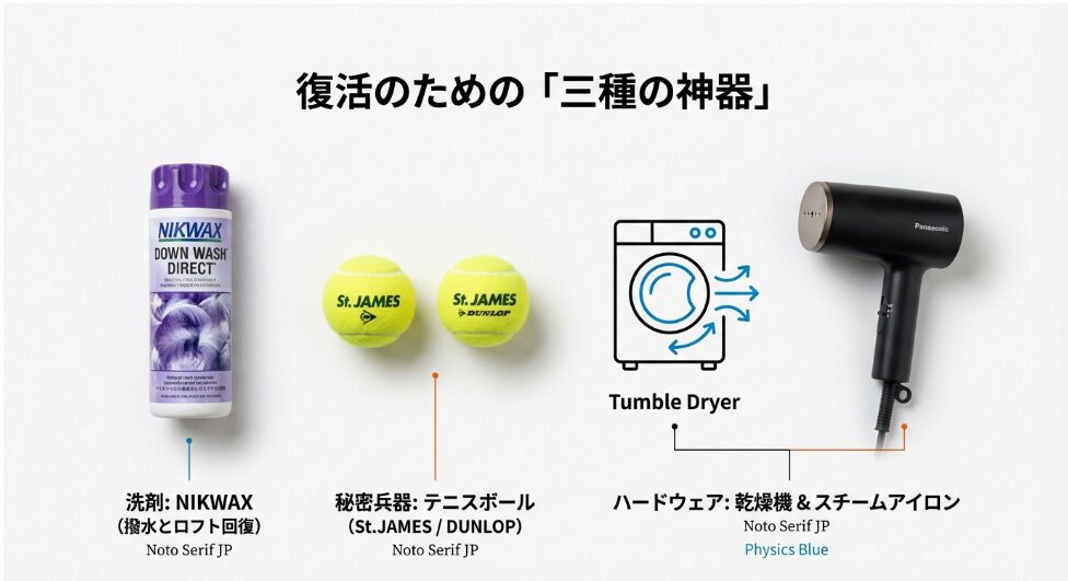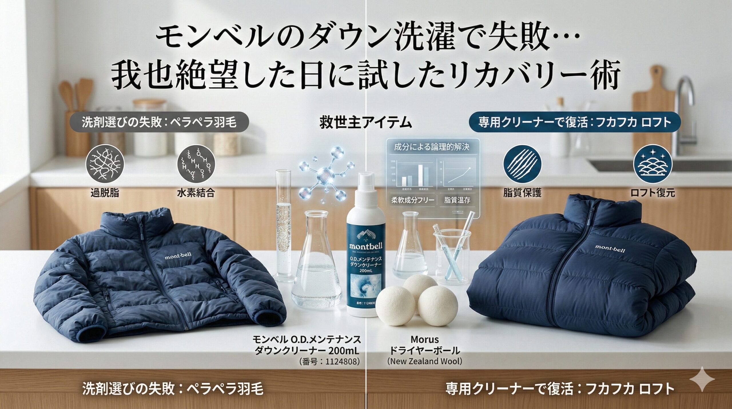 モンベル純正のクリーナーも優秀ですが、もし既に「ぺちゃんこ」にしてしまったのなら、それは日常の洗濯ではなく「緊急手術」が必要です。公式のさらに上を行く、理系ママ厳選のアイテムを投入しましょう。