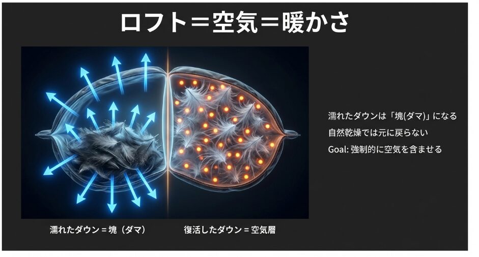 羽毛の脂を奪う「過脱脂」が起きると、羽同士が強力な「水素結合」を起こしてカチカチの塊になります。これを無理に引き剥がすと、EXダウンの繊細な骨格が折れ、二度と空気を孕まなくなります。だからこそ、汚れを落とす「洗浄」ではなく、構造を戻す「救済」の視点が必要なんです。