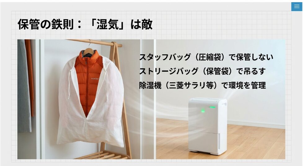 三菱の「サラリPro」のような大容量除湿機で、部屋の水分を文字通り「粉砕」しながら乾燥させる。これが、本格登山ギアを次シーズンまで最高の状態で保つ、唯一の道です。