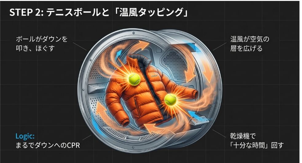 乾燥機は「低温・手動タイマー」で1時間。テニスボールを3個投入し、中のダマをタッピングします。乾燥終了後、熱いまま放置せず、すぐに山善のサーキュレーターで冷風を当ててください。EXダウンの膨らみは、熱が冷めていく過程で「構造が定着」します。この冷却プロセスこそが、1000FPを復活させるカヨ流の秘策です。