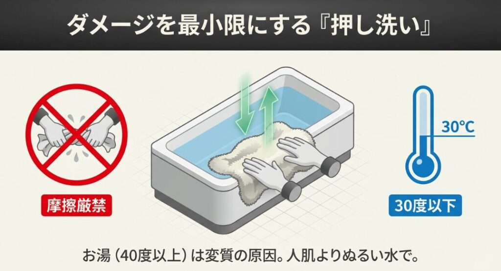 特に汚れを落とそうとしてゴシゴシ擦り洗いをしたり、全自動コースで長時間回したりするのは、ムートンにとって致命傷になります。また、アルカリ性の洗剤(普通の粉石鹸など)を使うと、スケールがより大きく開いてしまうため、フェルト化を加速させてしまいます。この「科学的な自滅」を防ぐには、いかに摩擦を減らし、いかにスケールを閉じ込めたまま洗うかが勝負になります。