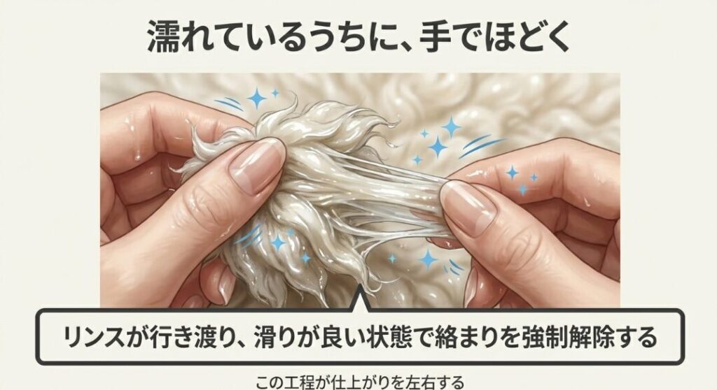 コツは、いきなり根元からガシガシいかないこと。毛先の方から、少しずつ優しく。100円のアイテムでここまで復活するの?と感動するレベルの変化が起きます。