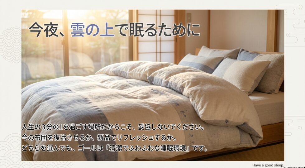 そして次からは、今回ご紹介したプロトコルをぜひ思い出してください。「ジャストサイズの洗濯ネット」、「中性洗剤での優しい洗浄」、そして何より敷布団の場合は「5箇所の結束」。このルールを守るだけで、ニトリの布団の洗濯で失敗する確率は劇的に下がります。自分で洗うのは少し手間かもしれませんが、綺麗になったフカフカの布団で眠る瞬間の幸せは、何物にも代えがたいですよね。