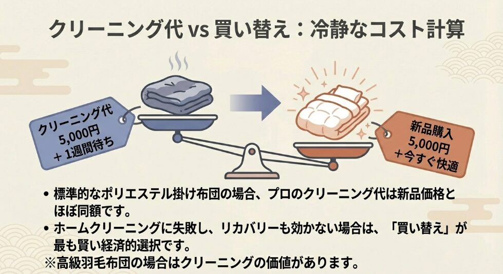 つまり、安価なモデルの場合は、プロに頼むお金で新品が買えてしまうという逆転現象が起きるんですね。ですから、購入から3〜5年ほど経っていて、中綿がヘタってきたり臭いが取れなくなったりしているポリエステル布団なら、無理に高いクリーニング代を払うよりは、感謝を込めて処分し、新しいモデルに買い替える方が衛生面でも経済面でも合理的かもしれません。最新のモデルは以前よりもさらに機能が進化していることも多いですしね。